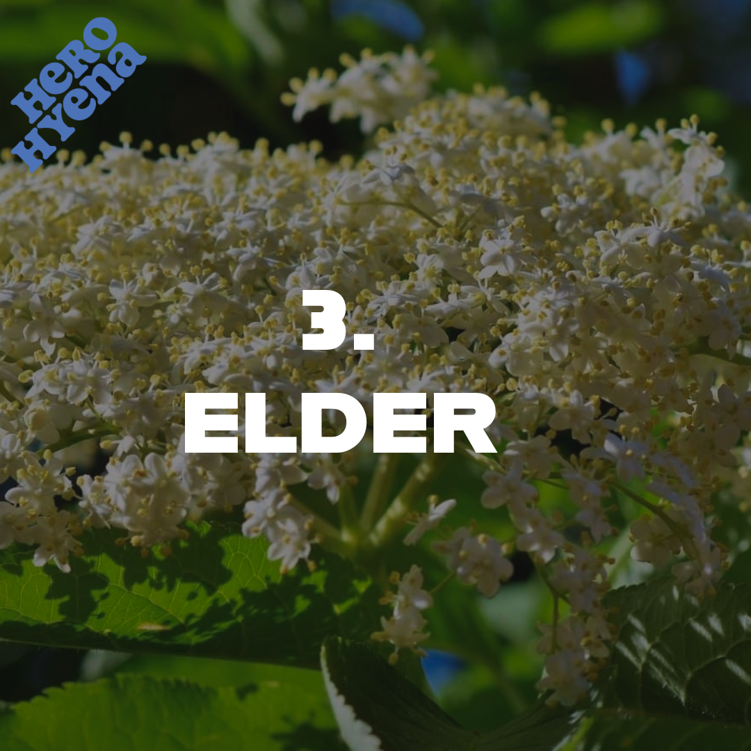 Common in hedgerows elderberries are a powerful immune booster. The flowers can be brewed into tea to ease colds, sinus infections and flu symptoms. Best seen MAY - JUN for flowers. SEP - OCT for berries. In hedgerows, woodlands, often near footpaths.